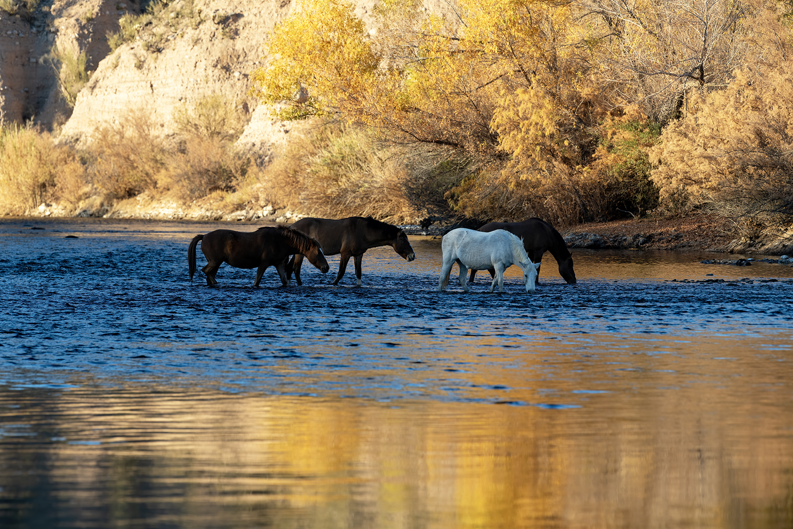 The Santa Cruz River with a reflection of the golden hues of the cottonwoods and sycamores along the river's corridor.