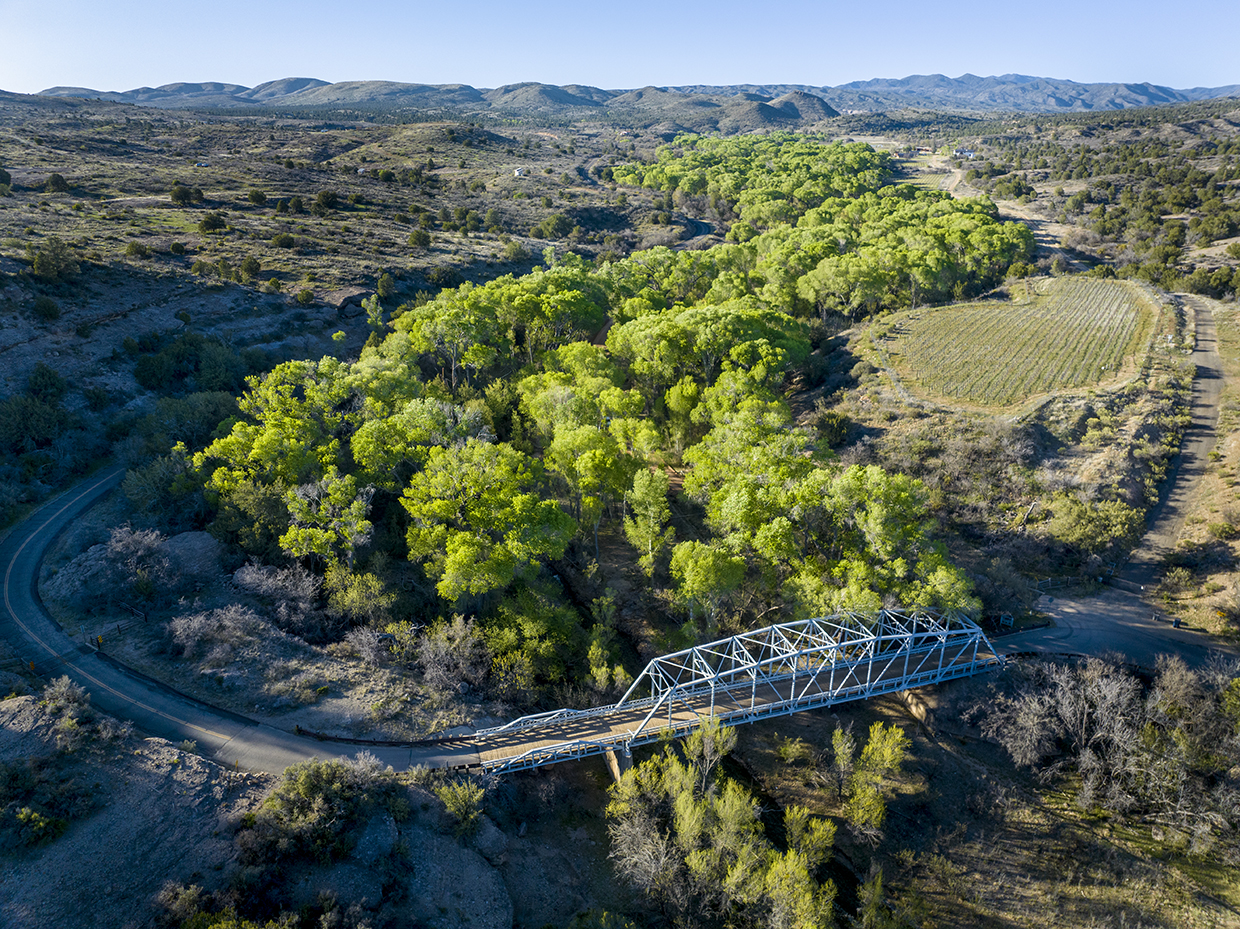 Soon thereafter, you’ll crest a hill and get a panoramic view of the Bradshaw Mountains to the east. You’ll then begin a descent toward the Hassayampa, which is marked by a vibrant ribbon of cottonwoods and other trees snaking through the desert. You’ll see other greenery, including junipers and piñon pines, en route to a historic bridge over the river at Mile 8.4.